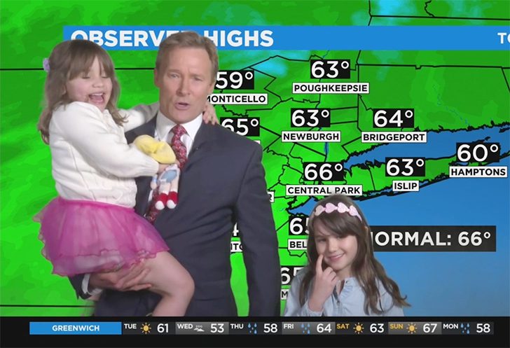 Lead weather anchor of WCBS-TV in New York, Lonnie Quinn, was busy giving his weather report for the day when his daughters, Lily and Savy joined their dad for a little chat. While he could’ve stopped the show or sent his daughters out of the door, Quinn continued with the report with creativity and professionalism. That day’s weather report got extra attention for this cute moment.