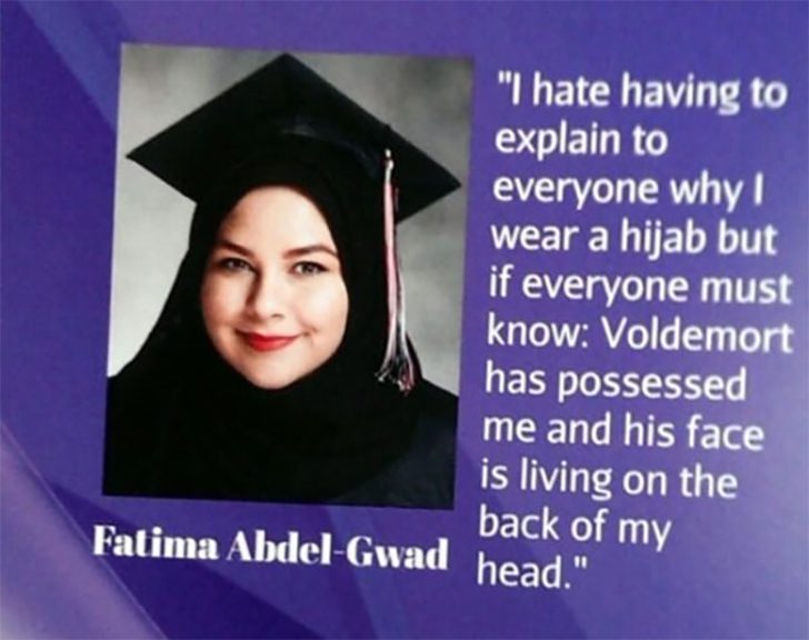 By all means, she stretched it by claiming the evil Voldermort lived in her head’s backside. Without a doubt, she’s in her hijab because of religion, but she just couldn’t help herself as a huge Potterhead.