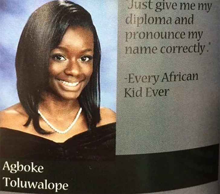 Agboke Toluwalope must have had enough of her name being butchered by lecturers and students alike. In her yearbook quote, she had the perfect opportunity to tell them just how she felt about it. We hope that the culprits saw it on time and worked on granting her wish.