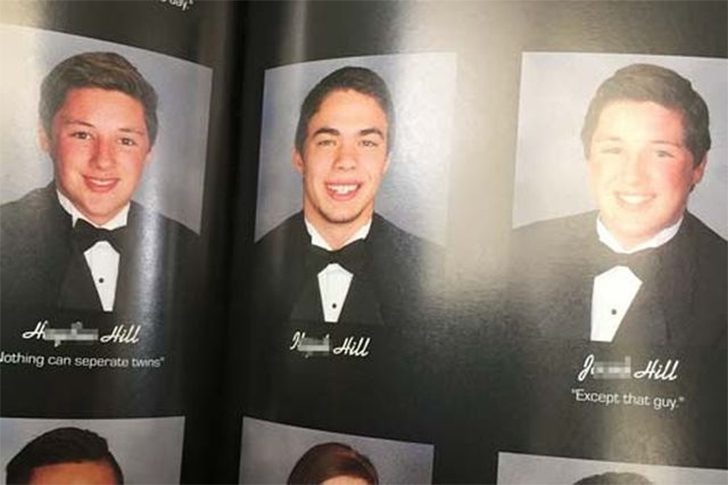 It is never easy to separate identical twins, even in a yearbook. In this case, we see for the first time twins separated in a yearbook by a guy with the same last name as theirs. These two had to settle for not being next to each other, and they made sure people noticed.
