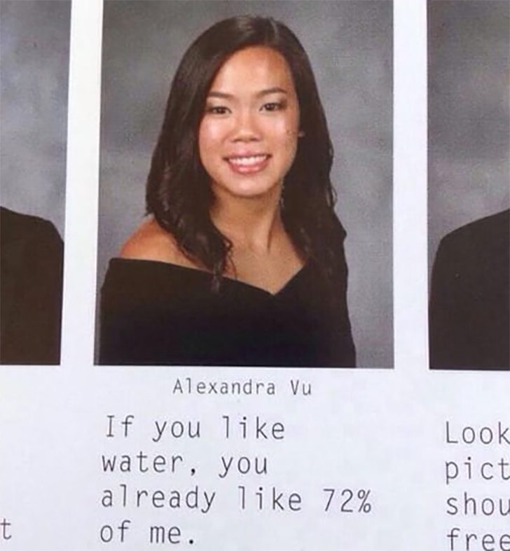 According to science, the human body is indeed made up of 72 percent water. And honestly, this yearbook quotation chosen by Alexandra can also pass off as a pick-up line. Nonetheless, she might’ve also had many admirers since she was such a bright, gorgeous gal.